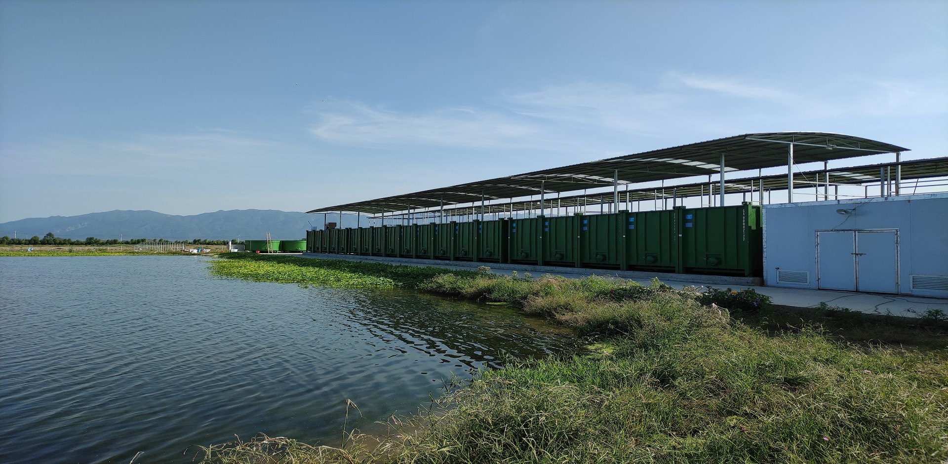 集裝箱式養(yǎng)殖系統(tǒng)采用 20 呎定制化“集裝箱”,尺寸是 6.1 米 *2.4 米 *2.8 米,養(yǎng)殖水體 25 立方米,占地面積為 15 平方米 ,配有納米增氧管(增氧)、出魚(yú)口(收魚(yú))、集污槽(排污)、天窗(觀察投喂飼料)、固液分離器(尾水處理)等功能構(gòu)件。